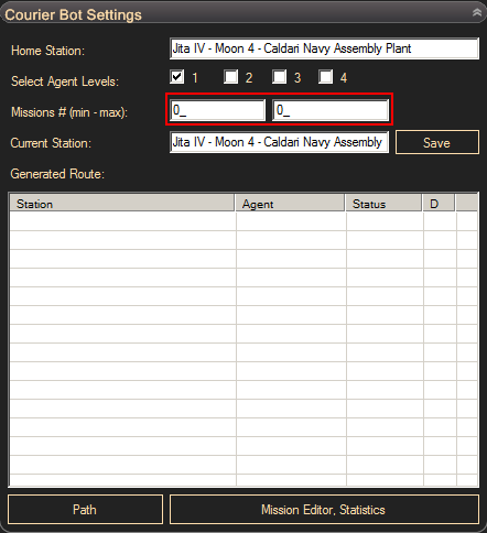 Implant collection module is used to generate and add simple pick up/drop off transport missions for implants (attribute enchancers or skill hardwirings) to courier bot queue. You may use it to collect implants from trade storiline missions and implants purchased for LP to home station with standard courier module. At first you need to finish current courier missions. Set min = 0 and max = 0 in settings of a courier and run bot till eve client is closed: